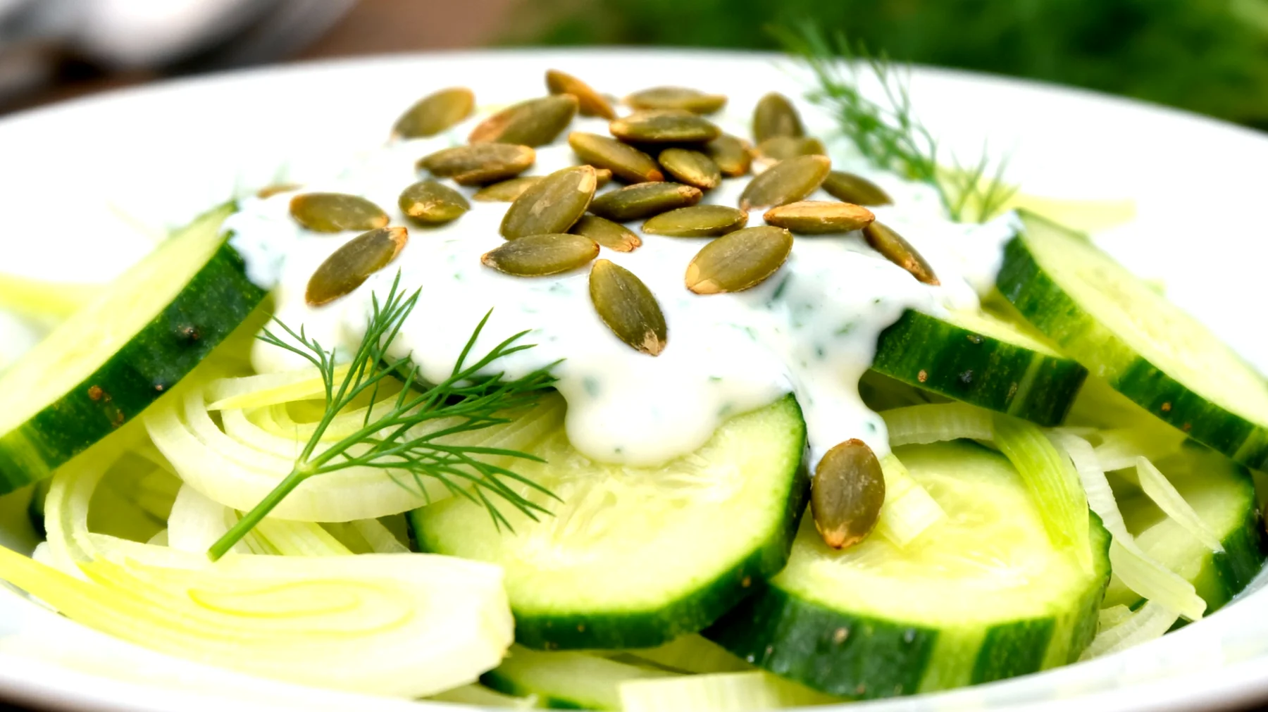 Die Komplexität der Zubereitung hält sich in Grenzen – perfekt für Menschen mit wenig Zeit. Der Fenchel wird in dünne Scheiben geschnitten oder mit einer Mandoline gehobelt, die Gurke ebenfalls in dünne Scheiben geschnitten. Beides kommt in eine Schüssel. Parallel rösten die Kürbiskerne in der Pfanne, während das Dressing angerührt wird. Nach zehn Minuten steht das Gericht auf dem Tisch.