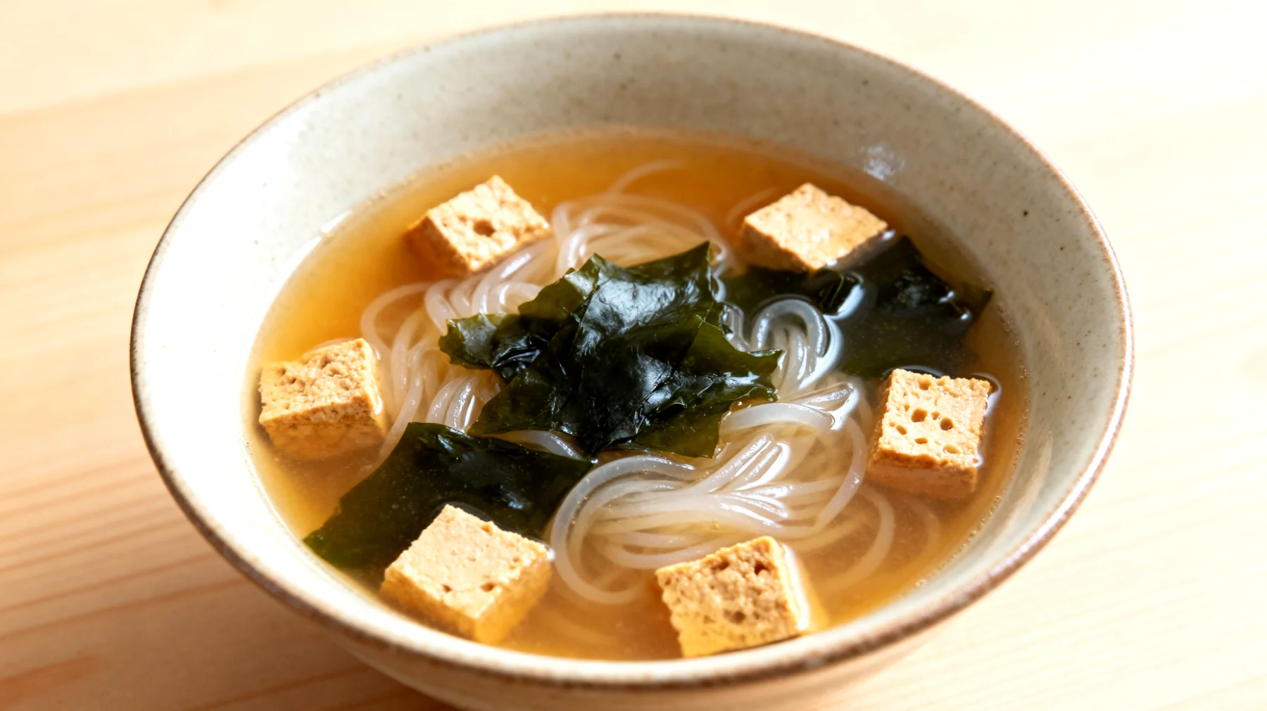 Die Reihenfolge bei der Zubereitung entscheidet über die Nährstoffausbeute. Zunächst eine Dashi-Brühe aus Kombu und Bonitoflocken kochen – oder auf eine fertige Instant-Variante zurückgreifen. Tempeh in Würfel schneiden und kurz anbraten, bis er leicht gebräunt ist. Wakame-Algen einige Minuten in lauwarmem Wasser einweichen. Die abgespülten Shirataki-Nudeln in die köchelnde Brühe geben und zwei Minuten ziehen lassen.
